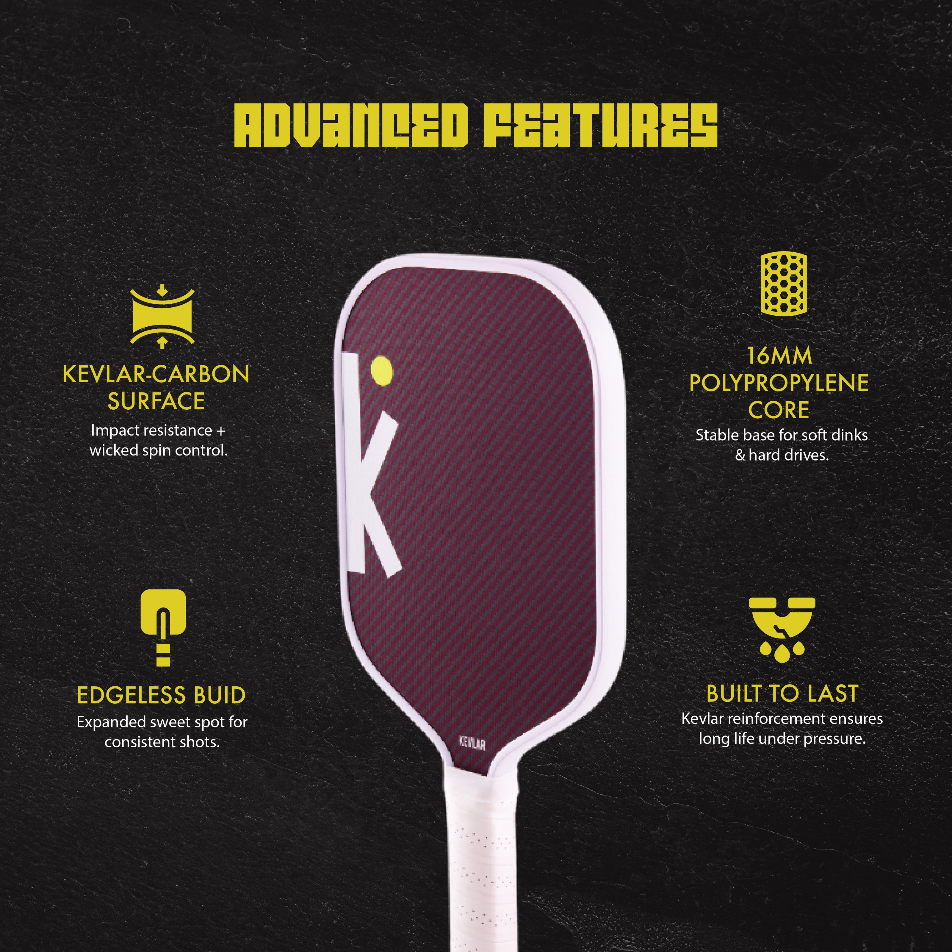 - Ergonomic Design: Designed with player comfort in mind, the Kevlar Paddle boasts an ergonomic grip that reduces hand fatigue during long matches. Its balanced weight distribution allows for effortless swings and quick reactions.